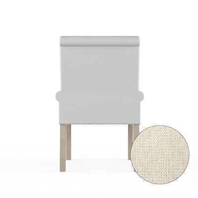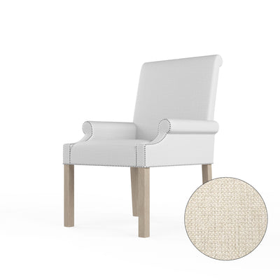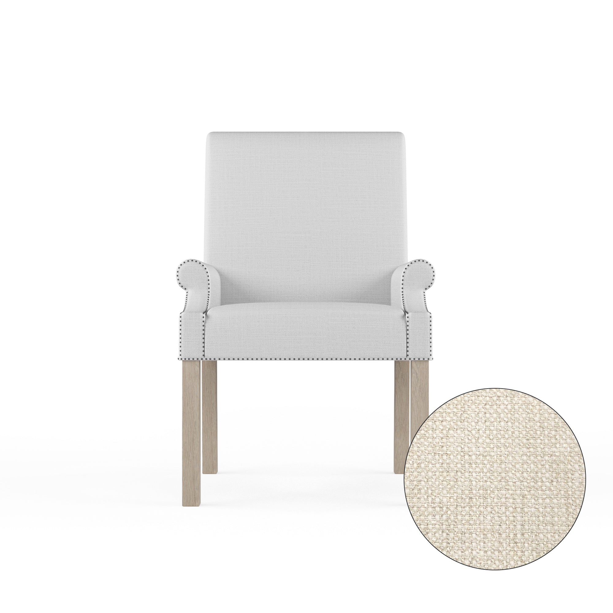 A regal armchair with petite rolled arms and a scrolled back. The arms and bottom edge are accented with nail tacks while the legs are angled for stability.