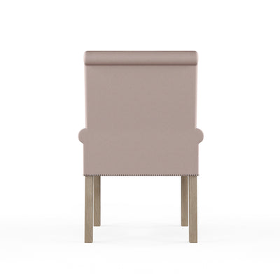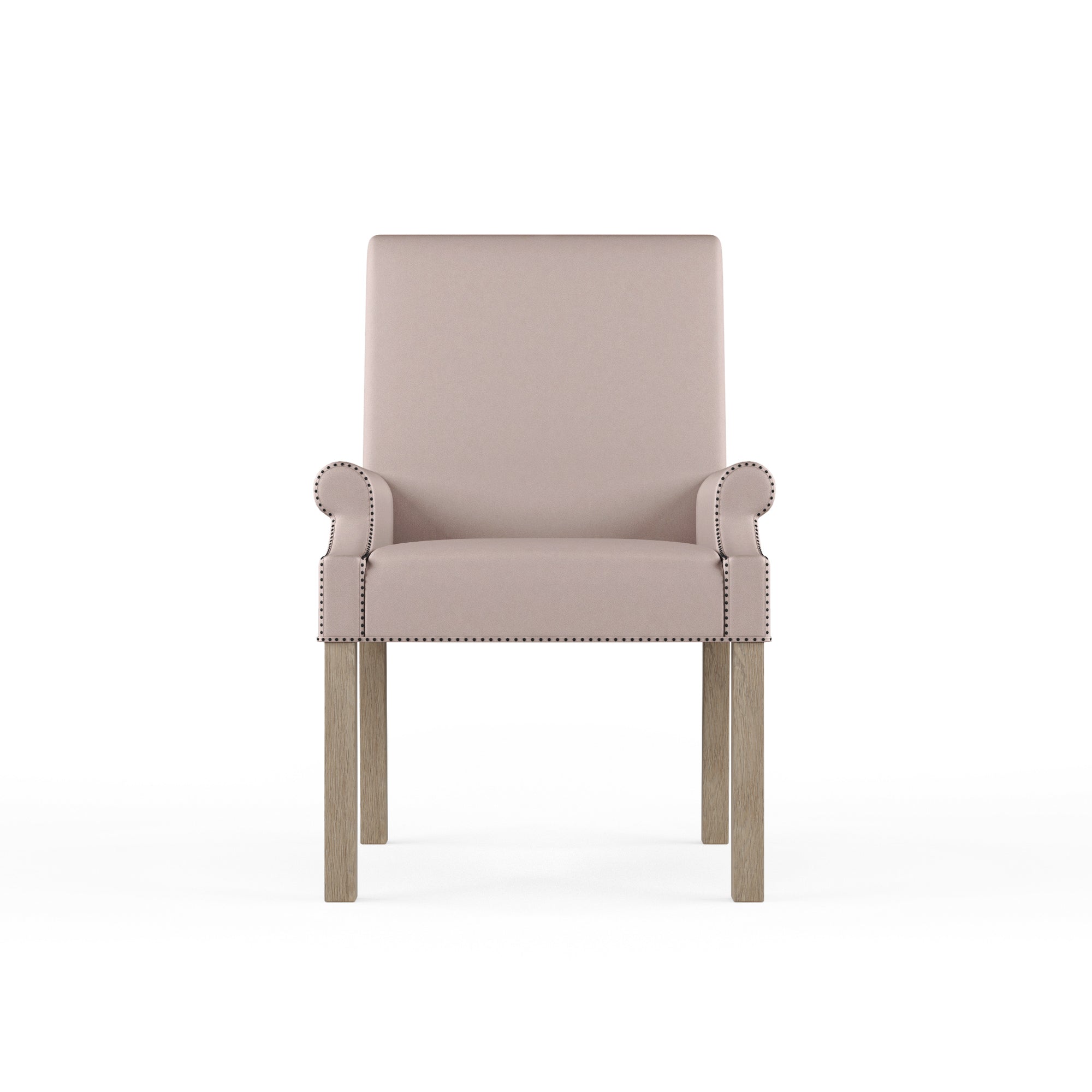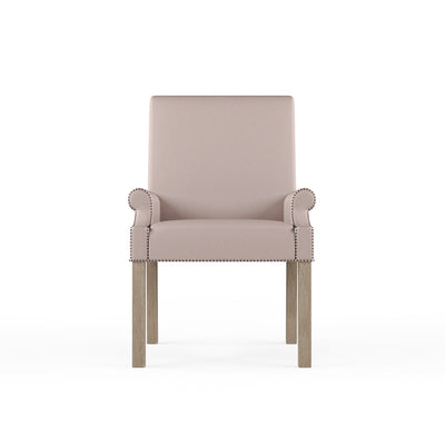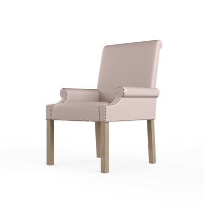 A regal armchair with petite rolled arms and a scrolled back. The arms and bottom edge are accented with nail tacks while the legs are angled for stability.