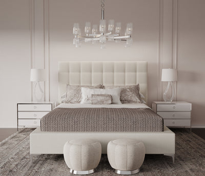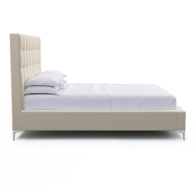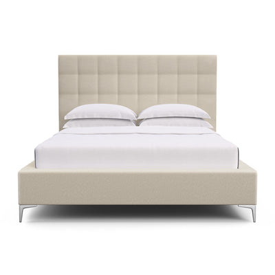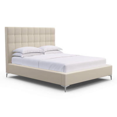 Understated with an elegant twist, this box-tufted bed is defined by crisp lines and the luxury of a hand tufted headboard. Fully upholstered and complemented by square block feet, this customizable platform bed is perfect for those seeking a low-profile addition to their bedroom.