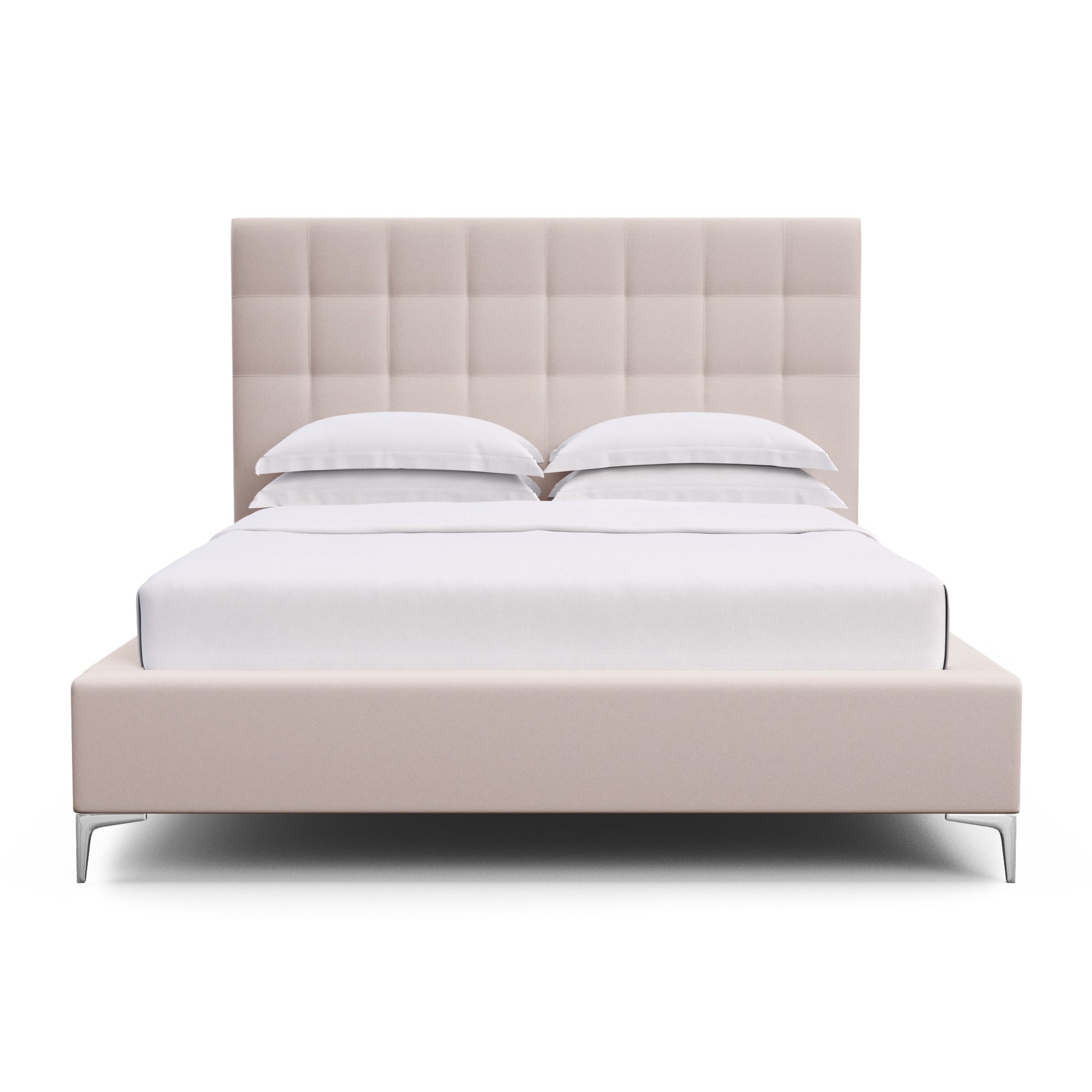 Understated with an elegant twist, this box pull-pleated bed is defined by crisp lines and the luxury of a hand tufted headboard. Fully upholstered and complemented by metal feet, this customizable platform bed is perfect for those seeking a low-profile addition to their bedroom.