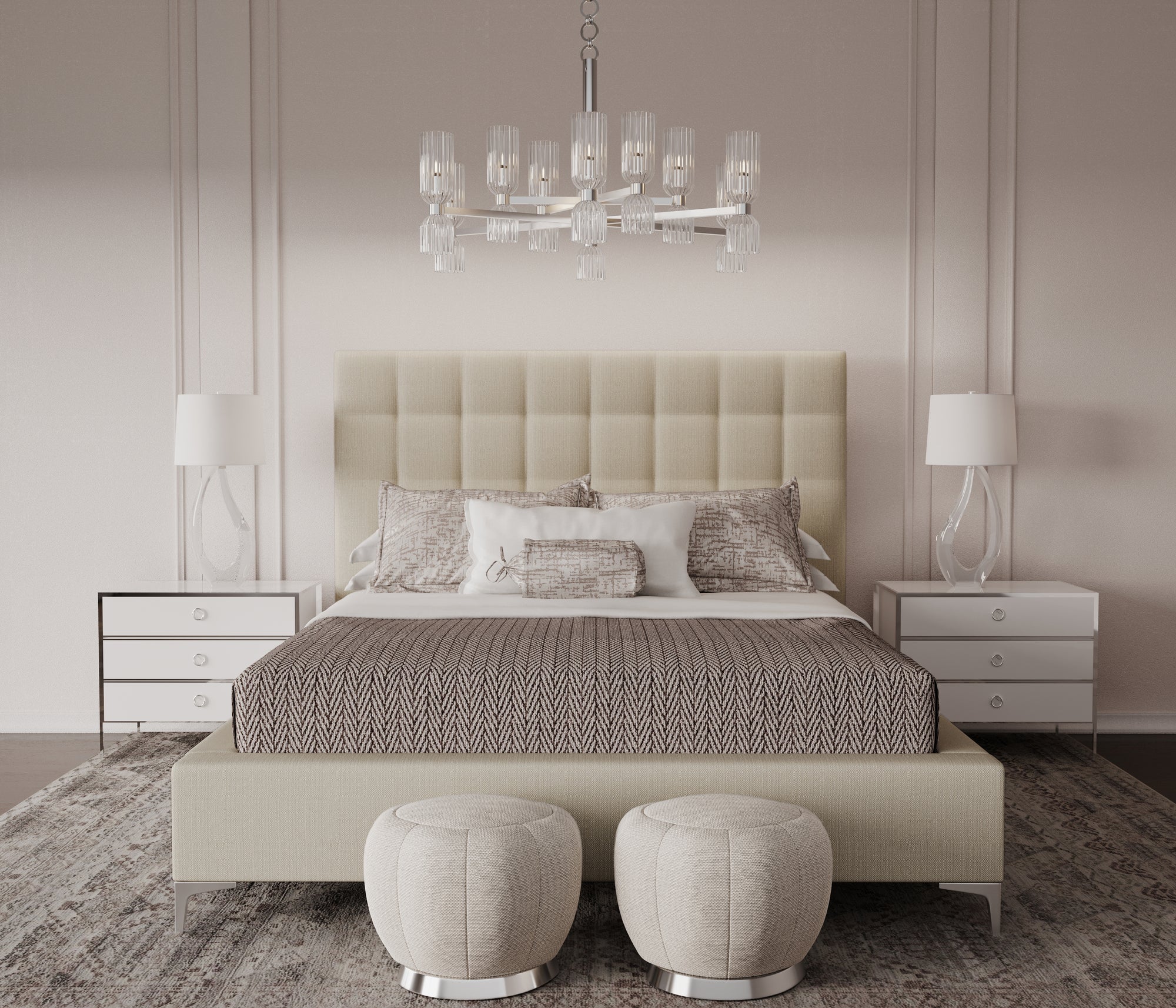 Understated with an elegant twist, this box-tufted bed is defined by crisp lines and the luxury of a hand tufted headboard. Fully upholstered and complemented by square block feet, this customizable platform bed is perfect for those seeking a low-profile addition to their bedroom.