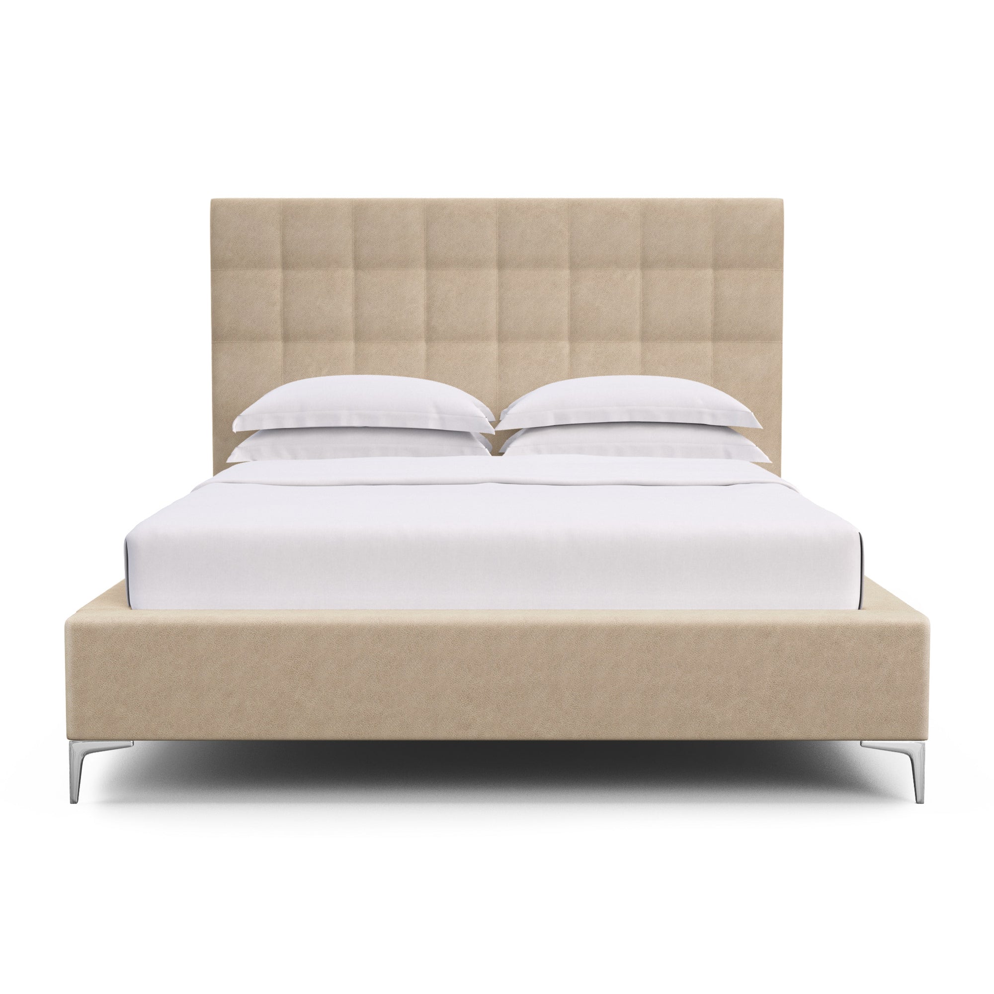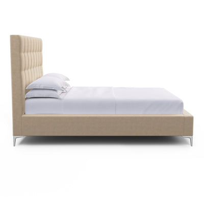 Understated with an elegant twist, this box-tufted bed is defined by crisp lines and the luxury of a hand tufted headboard. Fully upholstered and complemented by square block feet, this customizable platform bed is perfect for those seeking a low-profile addition to their bedroom.