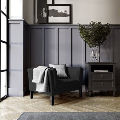 Perched atop elongated wooden legs, the Charlton Chair is the picture of classic furniture design. Devotees of 1920s styles will appreciate this modern interpretation. Featuring outwardly angled arms and a single-bench seat, it’s the perfect addition to stylish modern interiors.