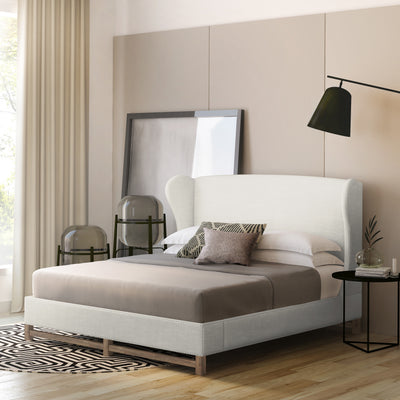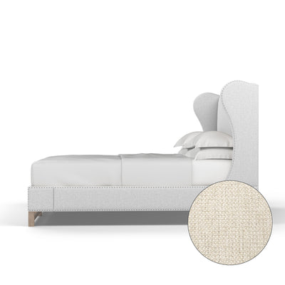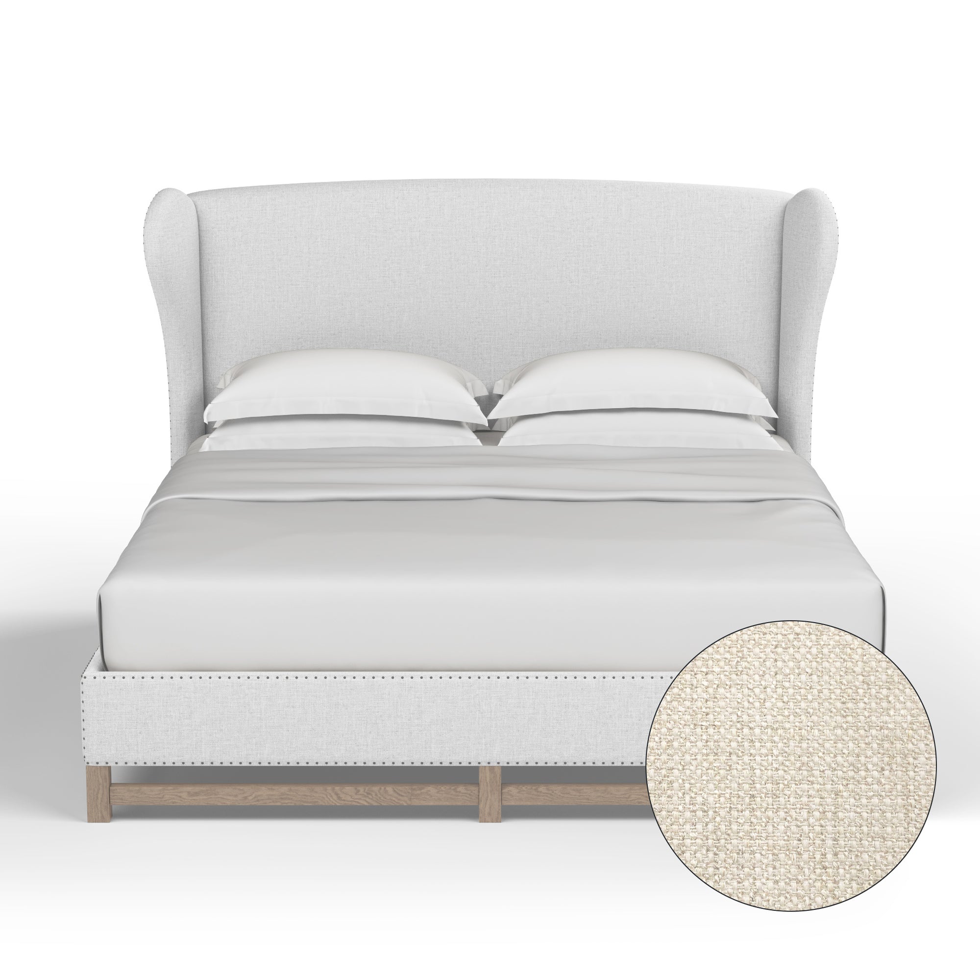This bed emanates a stately style. The striking wingback is complemented by a delicate nail head trim, and contemporary wooden foot rails. Its elegant silhouette makes this traditional style bed a magnificent bedroom centerpiece.