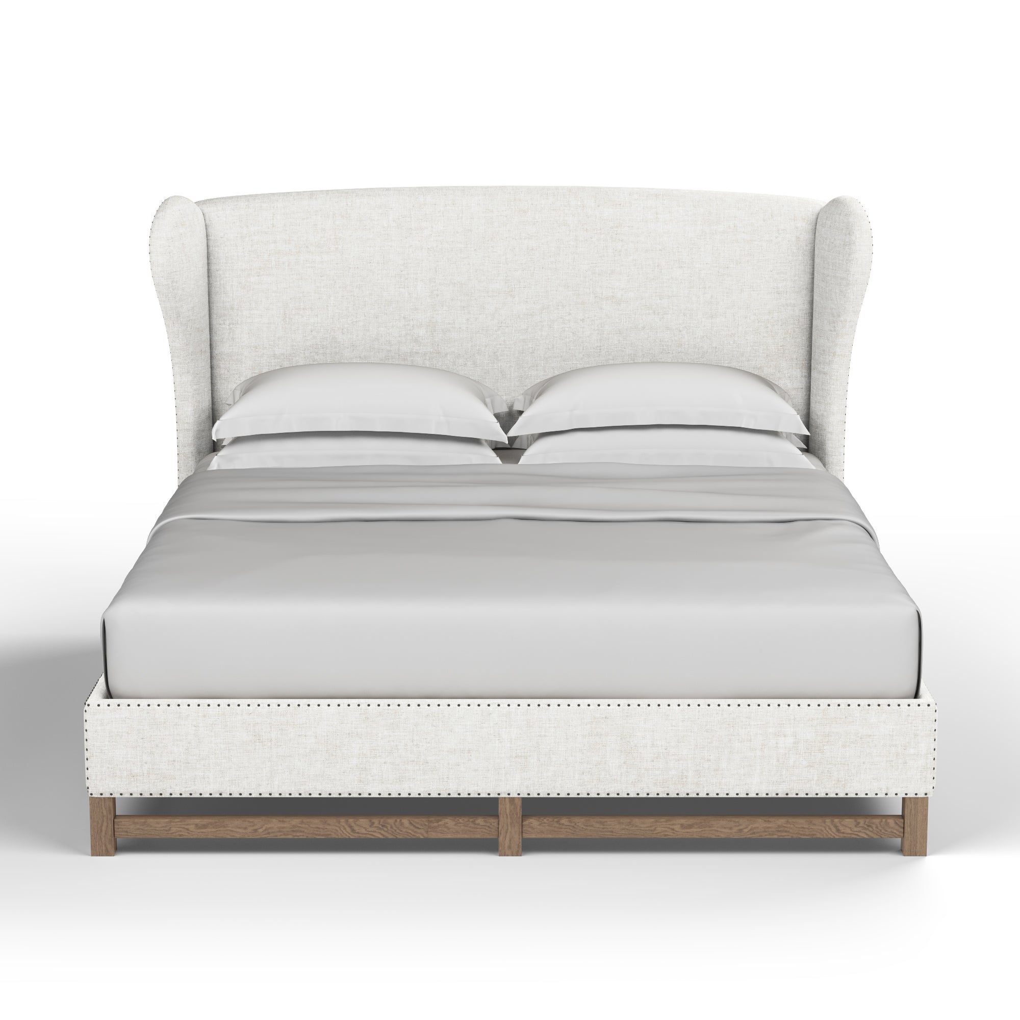 This bed emanates a stately style. The striking wingback is complemented by a delicate nail head trim, and contemporary wooden foot rails. Its elegant silhouette makes this traditional style bed a magnificent bedroom centerpiece.