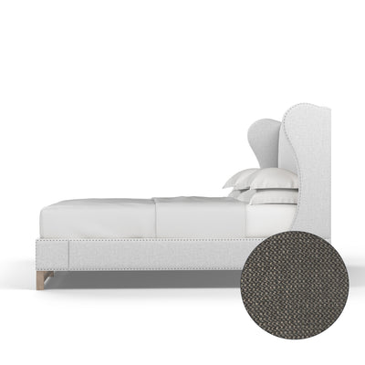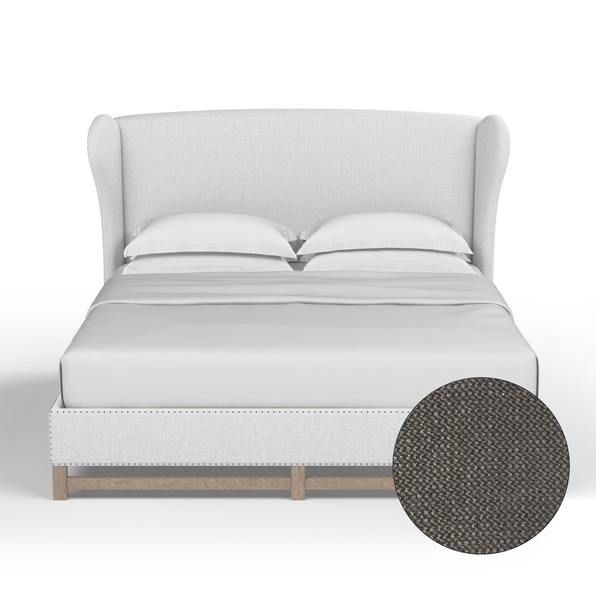This bed emanates a stately style. The striking wingback is complemented by a delicate nail head trim, and contemporary wooden foot rails. Its elegant silhouette makes this traditional style bed a magnificent bedroom centerpiece.