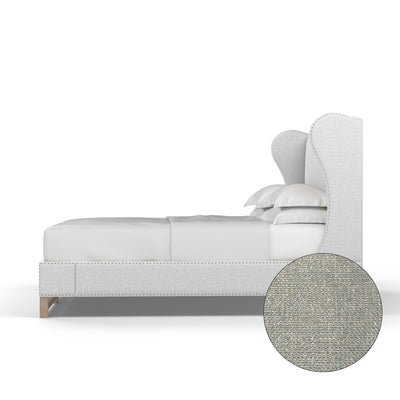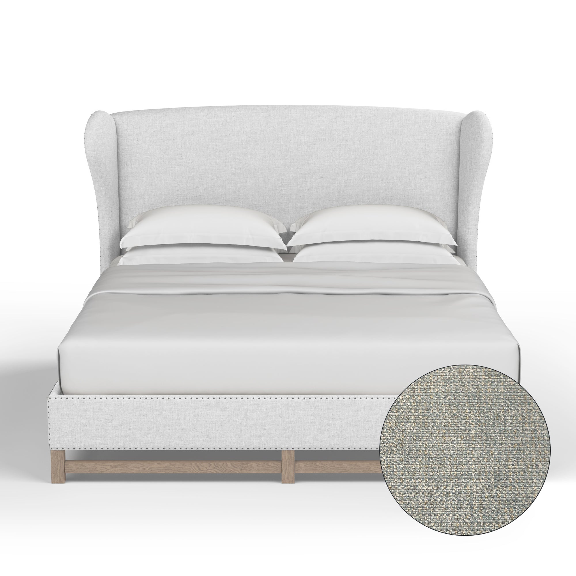 This bed emanates a stately style. The striking wingback is complemented by a delicate nail head trim, and contemporary wooden foot rails. Its elegant silhouette makes this traditional style bed a magnificent bedroom centerpiece.
