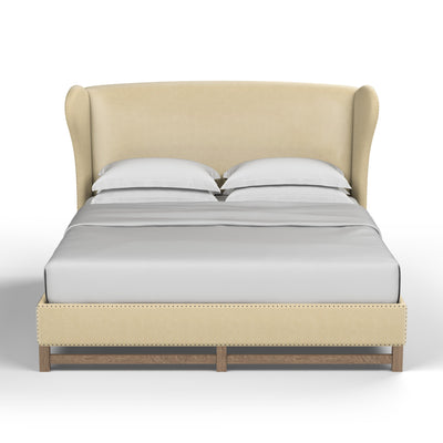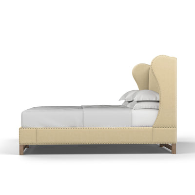 This bed emanates a stately style. The striking wingback is complemented by a delicate nail head trim, and contemporary wooden foot rails. Its elegant silhouette makes this traditional style bed a magnificent bedroom centerpiece.