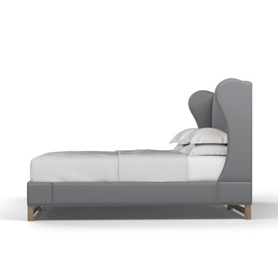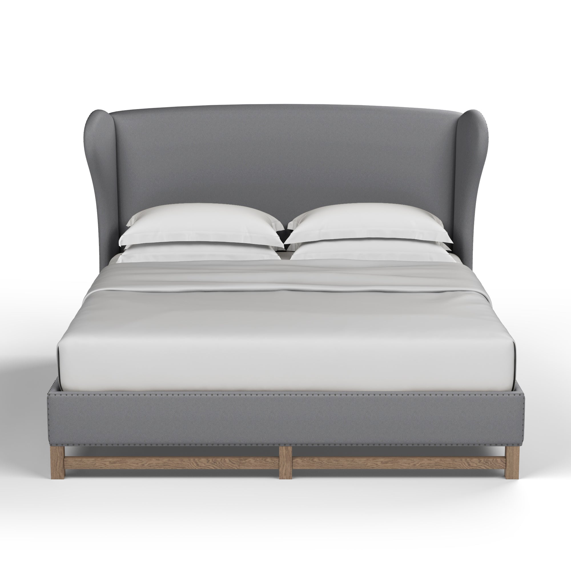 This bed emanates a stately style. The striking wingback is complemented by a delicate nail head trim, and contemporary wooden foot rails. Its elegant silhouette makes this traditional style bed a magnificent bedroom centerpiece.