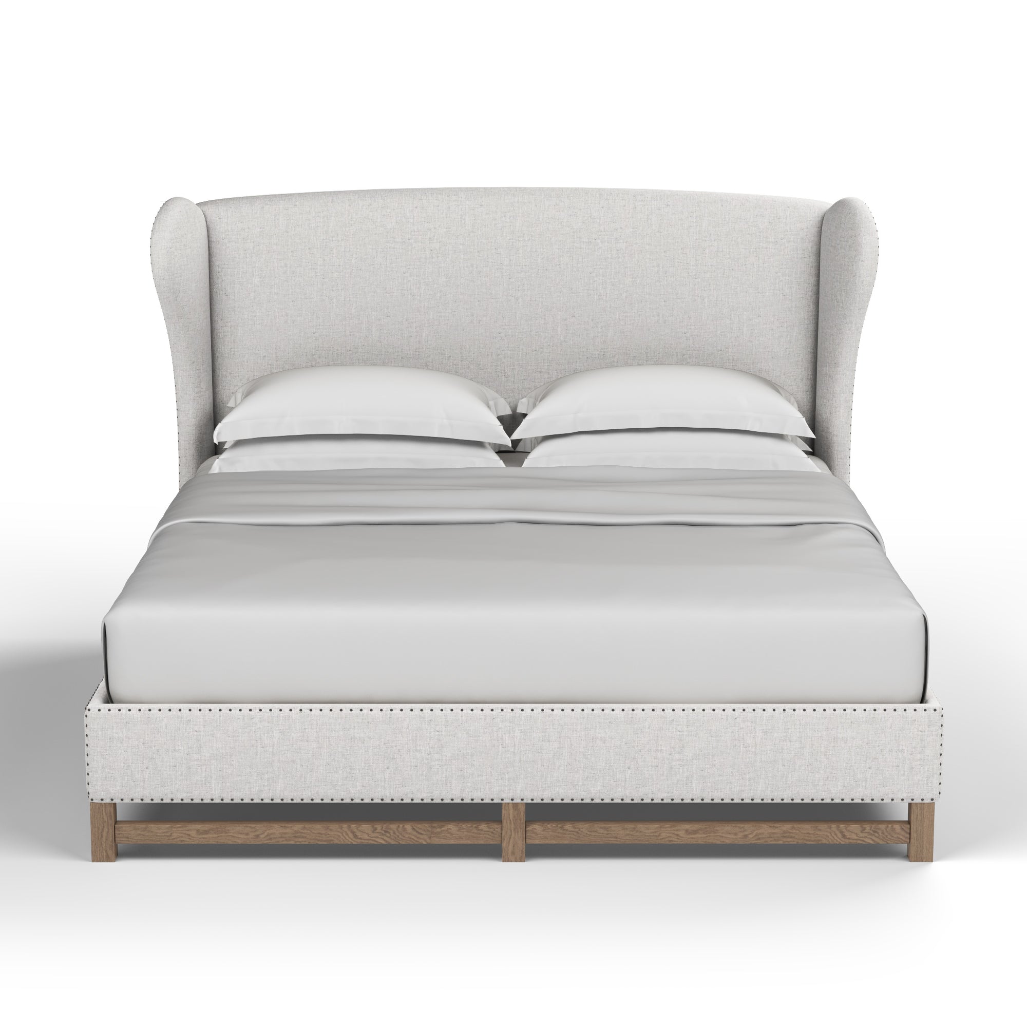 This bed emanates a stately style. The striking wingback is complemented by a delicate nail head trim, and contemporary wooden foot rails. Its elegant silhouette makes this traditional style bed a magnificent bedroom centerpiece.
