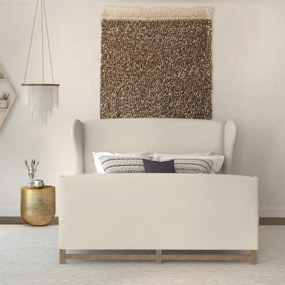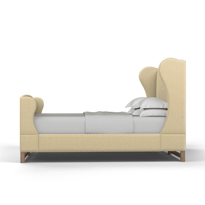 This bed emanates a stately style. The striking wingback is complemented by a delicate nail head trim, and contemporary wooden foot rails. Its elegant silhouette makes this traditional style bed a magnificent bedroom centerpiece.