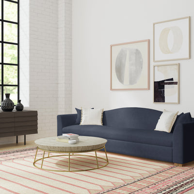 Transforms your living space with this modern interpretation of the classic camelback sofa design. A single graceful arch curves with symmetry atop the sofa back. The long, low bench seat has a contemporary flat profile flanked by tapered armrests and two square accent pillows.