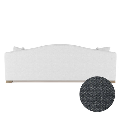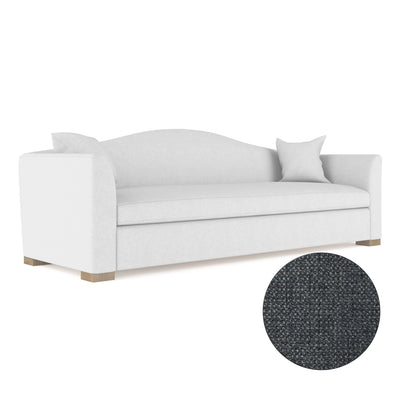 Transforms your living space with this modern interpretation of the classic camelback sofa design. A single graceful arch curves with symmetry atop the sofa back. The long, low bench seat has a contemporary flat profile flanked by tapered armrests and two square accent pillows.