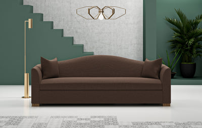 Transforms your living space with this modern interpretation of the classic camelback sofa design. A single graceful arch curves with symmetry atop the sofa back. The long, low bench seat has a contemporary flat profile flanked by tapered armrests and two square accent pillows.