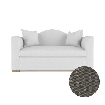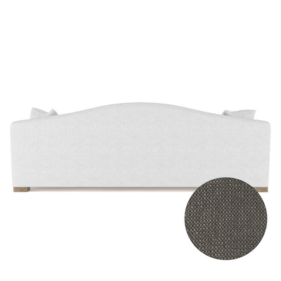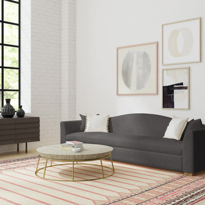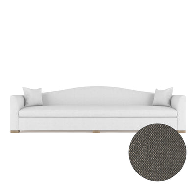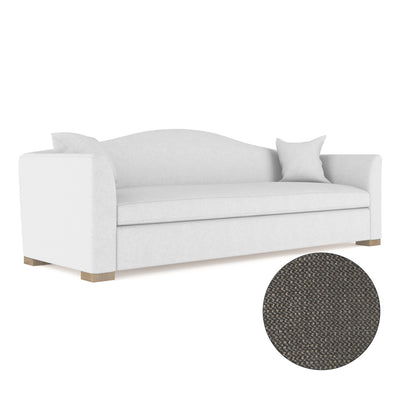 Transforms your living space with this modern interpretation of the classic camelback sofa design. A single graceful arch curves with symmetry atop the sofa back. The long, low bench seat has a contemporary flat profile flanked by tapered armrests and two square accent pillows.