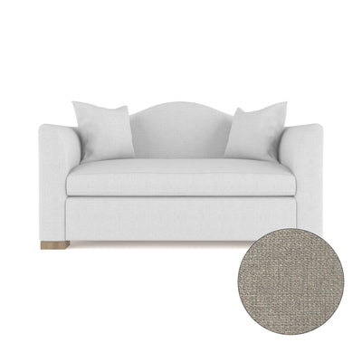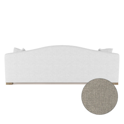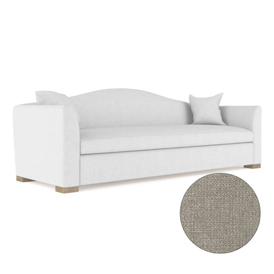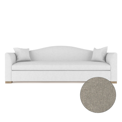 Transforms your living space with this modern interpretation of the classic camelback sofa design. A single graceful arch curves with symmetry atop the sofa back. The long, low bench seat has a contemporary flat profile flanked by tapered armrests and two square accent pillows.