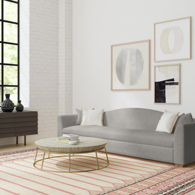 Transforms your living space with this modern interpretation of the classic camelback sofa design. A single graceful arch curves with symmetry atop the sofa back. The long, low bench seat has a contemporary flat profile flanked by tapered armrests and two square accent pillows.