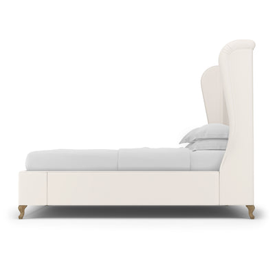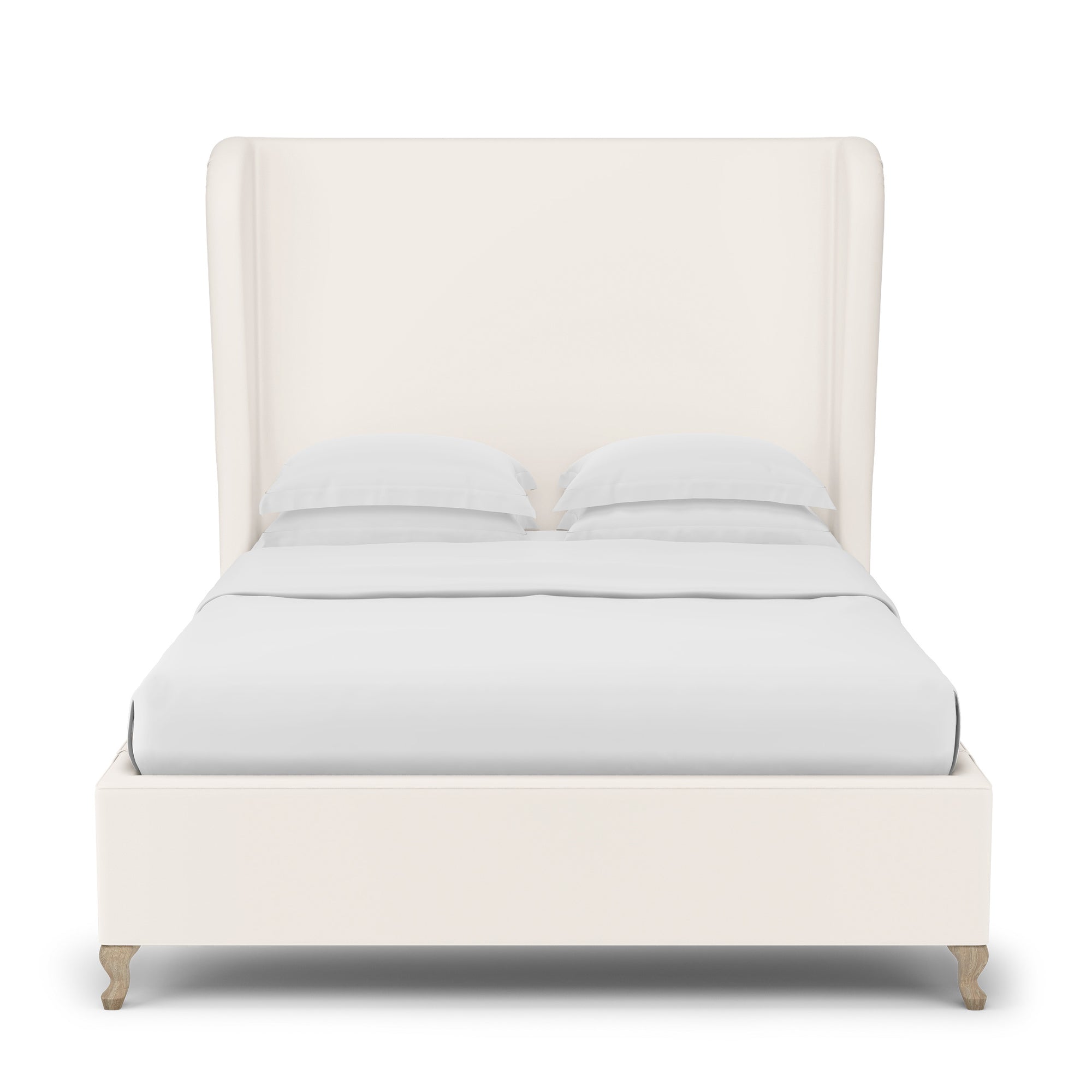 This soft, sweeping and rolled bed frame is a modern update to a classic shelter and wingback bed. The tailored bed with piping detail, rests on solid queen anne feet that acenuate the curves of the silhouette.