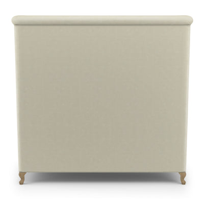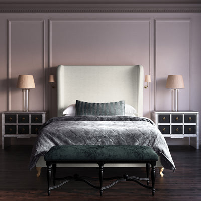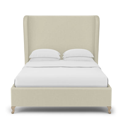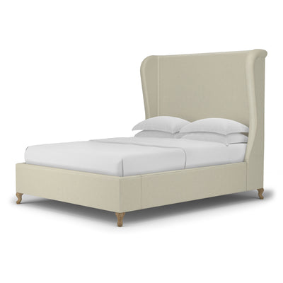 This soft, sweeping and rolled bed frame is a modern update to a classic shelter and wingback bed. The tailored bed with piping detail, rests on solid queen anne feet that acenuate the curves of the silhouette.