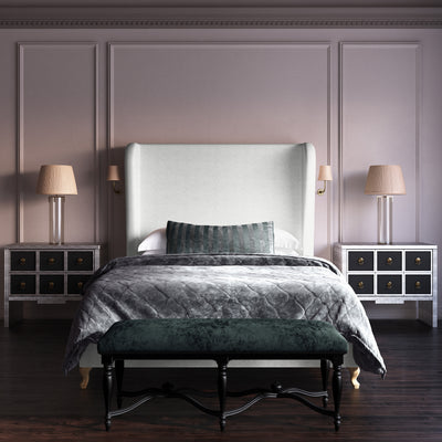 This soft, sweeping and rolled bed frame is a modern update to a classic shelter and wingback bed. The tailored bed with piping detail, rests on solid queen anne feet that acenuate the curves of the silhouette.