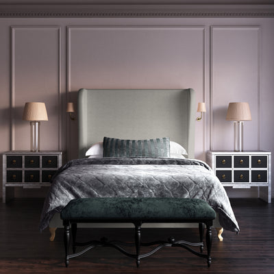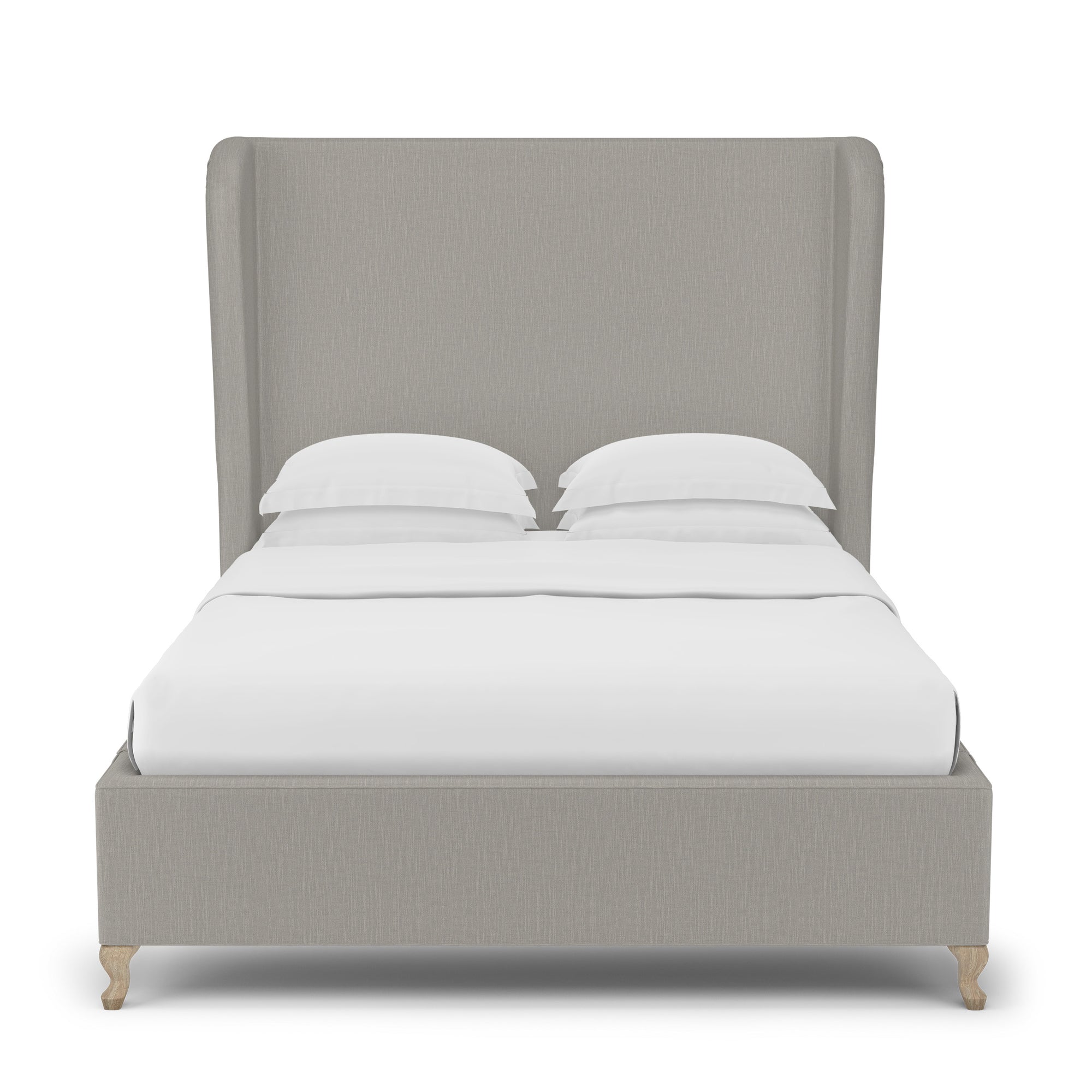 This soft, sweeping and rolled bed frame is a modern update to a classic shelter and wingback bed. The tailored bed with piping detail, rests on solid queen anne feet that acenuate the curves of the silhouette.