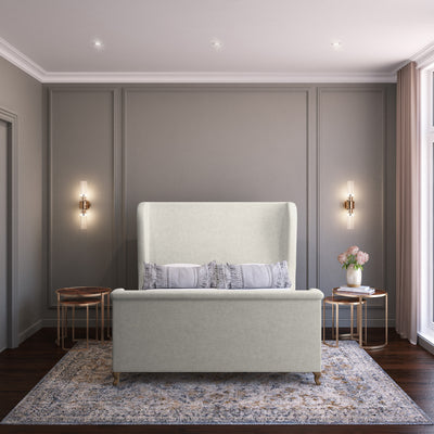 This soft, sweeping and rolled bed frame is a modern update to a classic shelter and wingback bed. The tailored bed with piping detail, rests on solid queen anne feet that acenuate the curves of the silhouette.