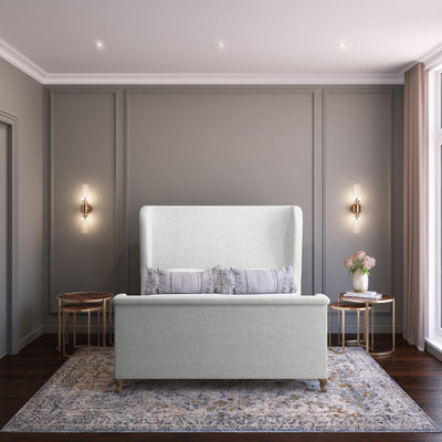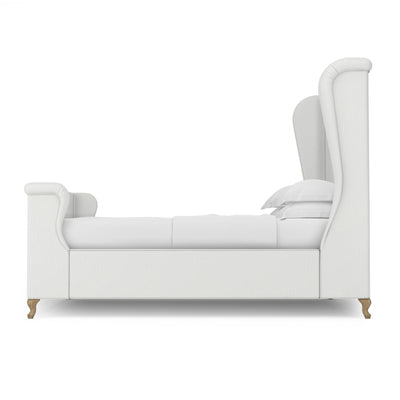 This soft, sweeping and rolled bed frame is a modern update to a classic shelter and wingback bed. The tailored bed with piping detail, rests on solid queen anne feet that acenuate the curves of the silhouette.