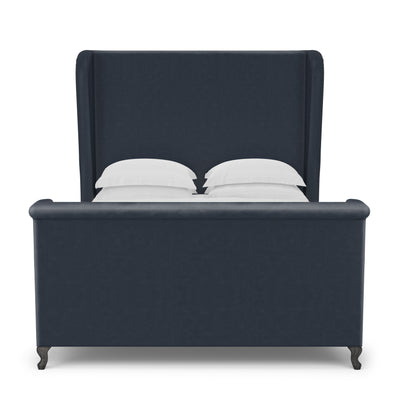 This soft, sweeping and rolled bed frame is a modern update to a classic shelter and wingback bed. The tailored bed with piping detail, rests on solid queen anne feet that acenuate the curves of the silhouette.