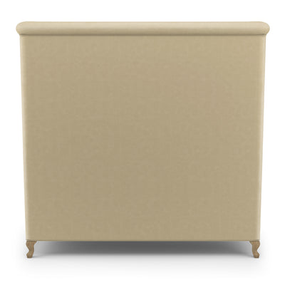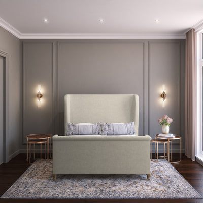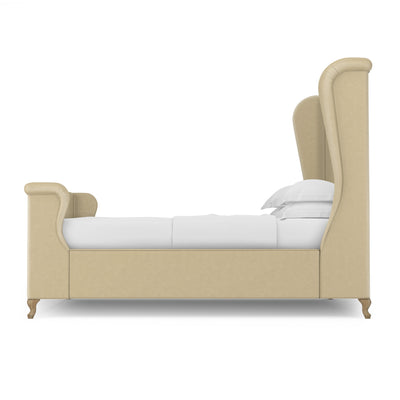 This soft, sweeping and rolled bed frame is a modern update to a classic shelter and wingback bed. The tailored bed with piping detail, rests on solid queen anne feet that acenuate the curves of the silhouette.