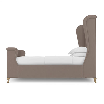 This soft, sweeping and rolled bed frame is a modern update to a classic shelter and wingback bed. The tailored bed with piping detail, rests on solid queen anne feet that acenuate the curves of the silhouette.