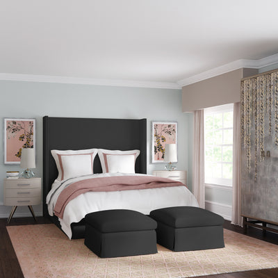 This modern shelter bed possesses smooth edges and clean geometric lines that magnify its calculated simplicity. Enhanced with a double row of nailhead trim, and a fitted waterfall skirt, these details add a polished flair.