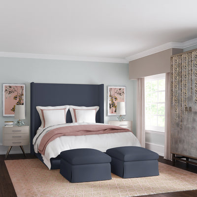 This modern shelter bed possesses smooth edges and clean geometric lines that magnify its calculated simplicity. Enhanced with a double row of nailhead trim, and a fitted waterfall skirt, these details add a polished flair.