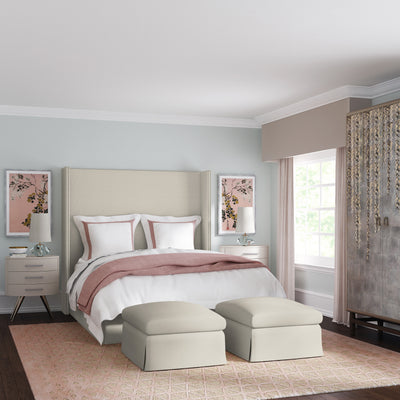 This modern shelter bed possesses smooth edges and clean geometric lines that magnify its calculated simplicity. Enhanced with a double row of nailhead trim, and a fitted waterfall skirt, these details add a polished flair.