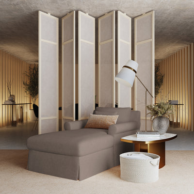 The Ludlow Chaise pairs the comforts of traditional design with striking modern features. Enjoy the ease of its elongated single bench seat and back-supporting cushion, surrounded by traditional roll-arms and a waterfall skirt.