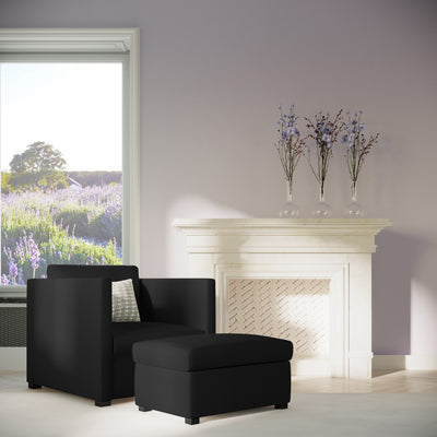 A handsome companion to the Madison seating collection, this ottoman makes an equally lovely accent piece to mix with other furniture thanks to its elegant, versatile design. A thick rounded base is topped with a thinner cushion, slightly proud and overstuffed, for relaxed comfort in traditional or modern spaces.