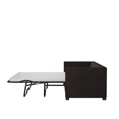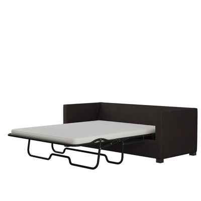 The Madison Sleeper Sofa beautifies any interior style with its clean-lined sophistication. The low, deep profile is modest and refined with its narrow arms and slim profile. When ready, the sleeper seamlessly pulls out to a cushy, memory foam mattress, instantly creating an additional bed.