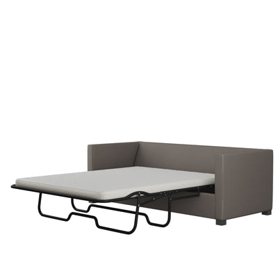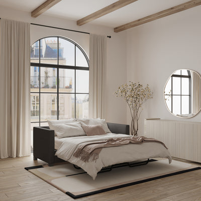 The Madison Sleeper Sofa beautifies any interior style with its clean-lined sophistication. The low, deep profile is modest and refined with its narrow arms and slim profile. When ready, the sleeper seamlessly pulls out to a cushy, memory foam mattress, instantly creating an additional bed.