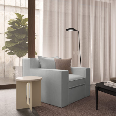 A bold, modern silhouette, the Mulberry Chair offers enveloping comfort with its large track arms and sturdy square profile. Its low, informal silhouette delivers versatile seating for the modern home, complemented by a curved back cushion.