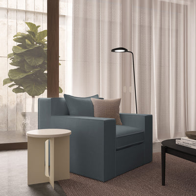 A bold, modern silhouette, the Mulberry Chair offers enveloping comfort with its large track arms and sturdy square profile. Its low, informal silhouette delivers versatile seating for the modern home, complemented by a curved back cushion.