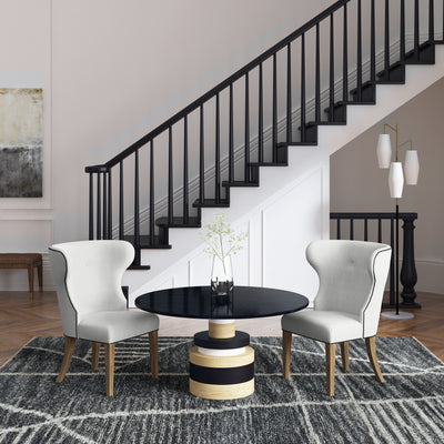 A curved wingback dining chair is grand in scale but not in size. The decorative tufted, nail trim and tapered legs add a stylish flair and comfort.