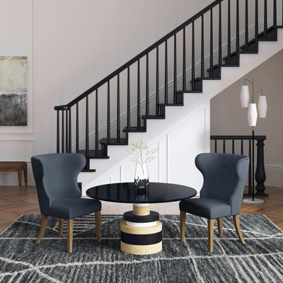 A curved wingback dining chair is grand in scale but not in size. The decorative tufted, nail trim and tapered legs add a stylish flair and comfort.
