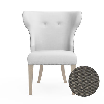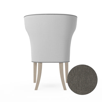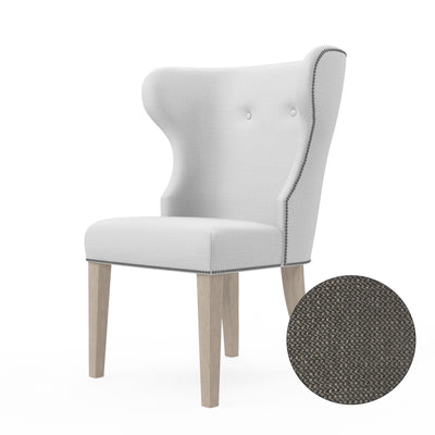 A curved wingback dining chair is grand in scale but not in size. The decorative tufted, nail trim and tapered legs add a stylish flair and comfort.