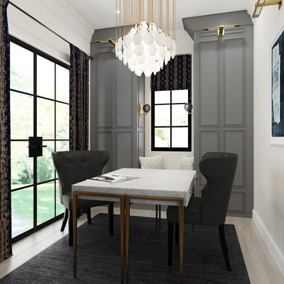 A curved wingback dining chair is grand in scale but not in size. The decorative tufted, nail trim and tapered legs add a stylish flair and comfort.