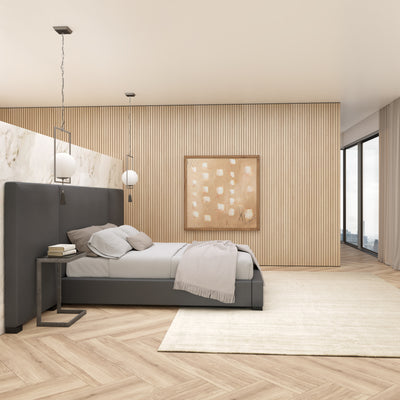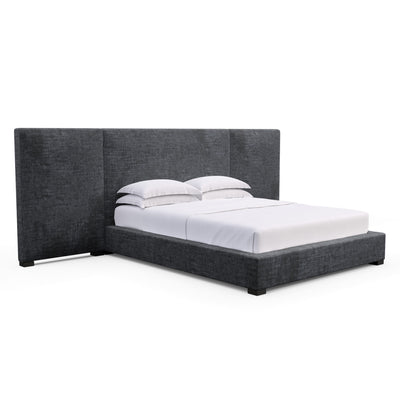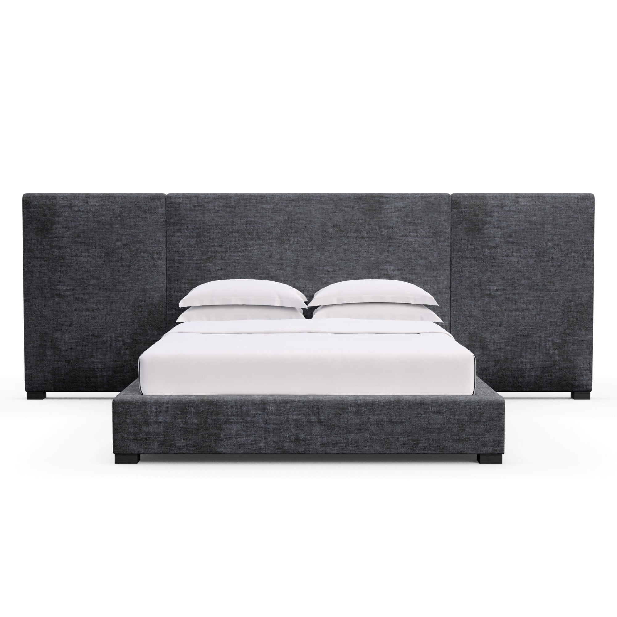 A play on balance and proportion, this platform bed is meant to be the centerpiece of your bedroom. The headboard, featuring crisp lines and hand-upholstered panels, extends on both sides to accommodate accent furniture. Anchored by square block feet, this piece is all about the sculptural details.