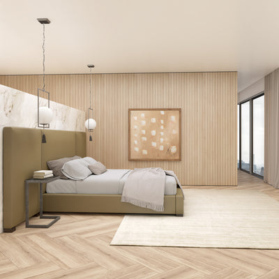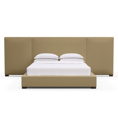 A play on balance and proportion, this platftorm bed is meant to be the centerpiece of your bedroom. The headboard, featuring crisp lines and handupholstered panels, extends on both sides to accommodate accent furniture. Anchored by square block feet, this piece is all about the sculptural details.
