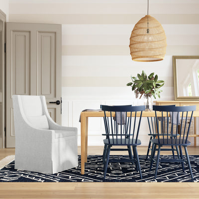 A classic, slim slope arm chair with a high back and fitted waterfall skirt. A lumbar pillow and seat cushion offer additional comfort and support.