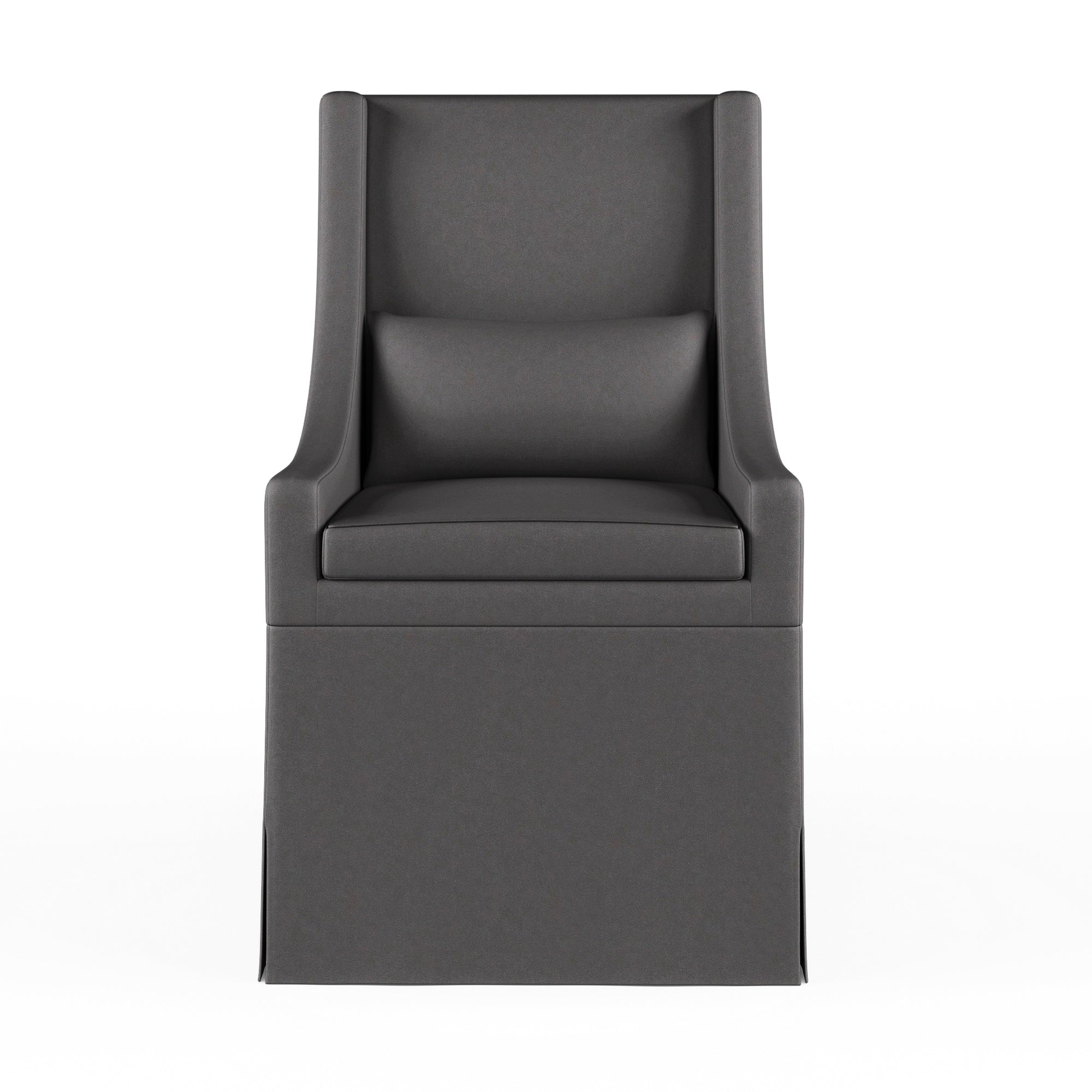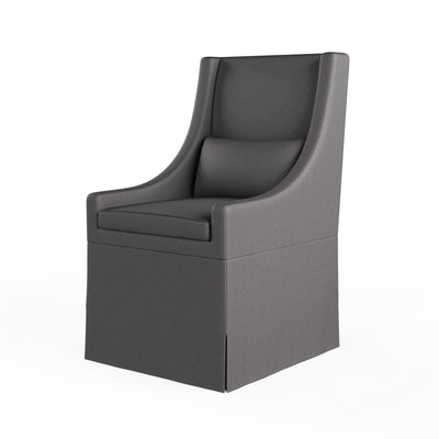A classic, slim slope arm chair with a high back and fitted waterfall skirt. A lumbar pillow and seat cushion offer additional comfort and support.