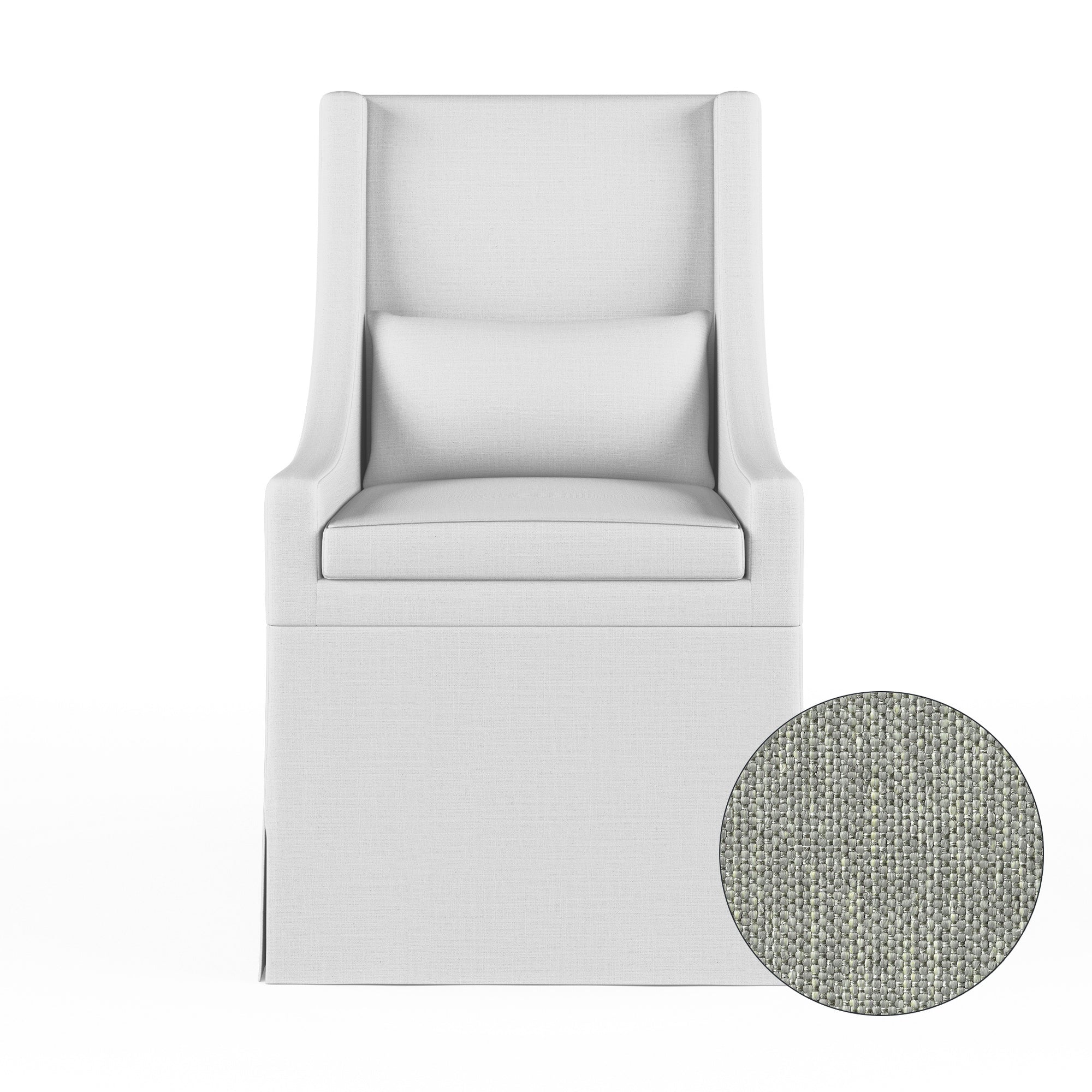 A classic, slim slope arm chair with a high back and fitted waterfall skirt. A lumbar pillow and seat cushion offer additional comfort and support.