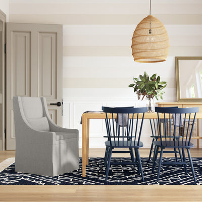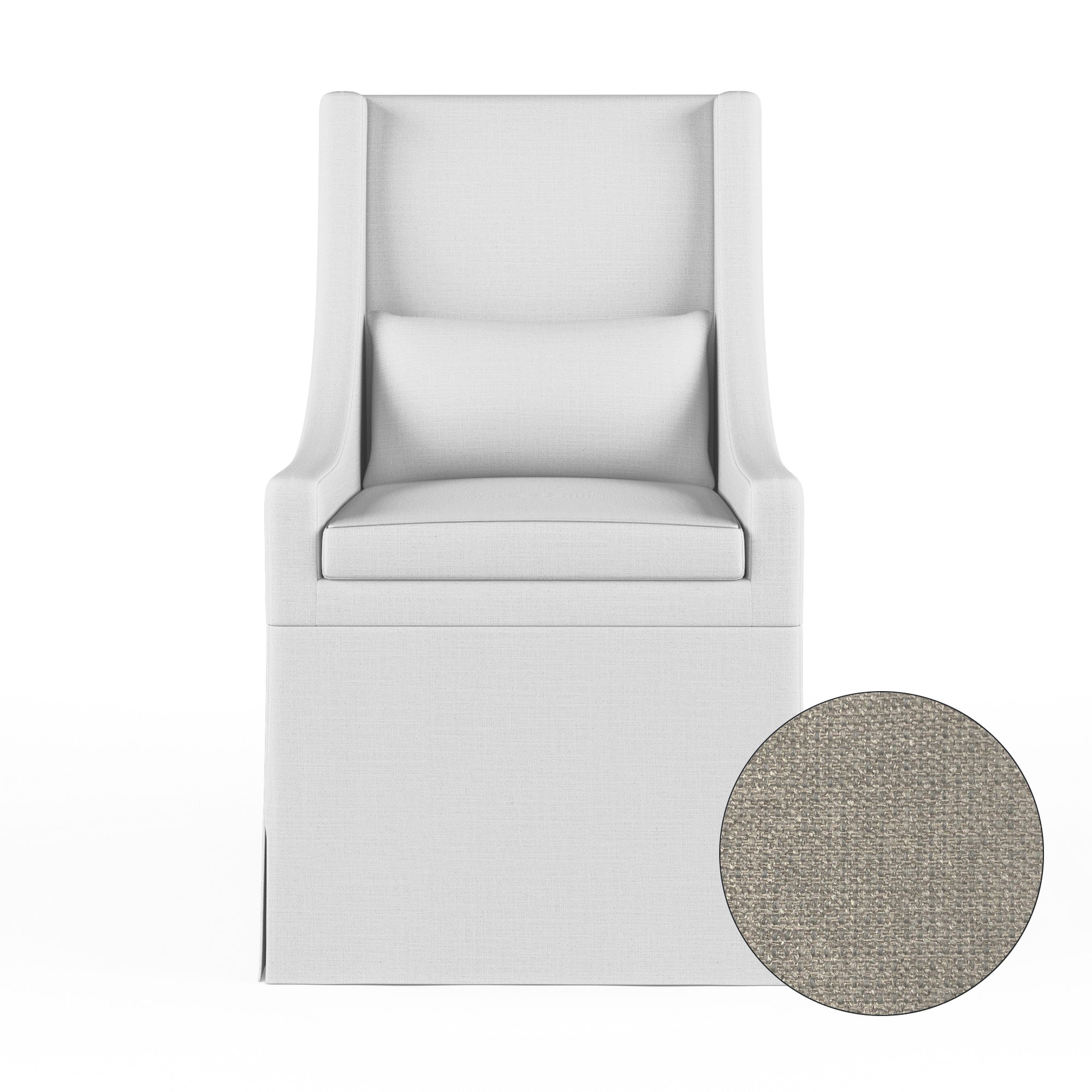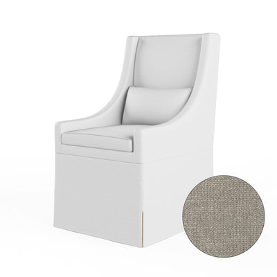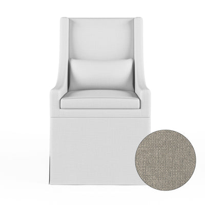 A classic, slim slope arm chair with a high back and fitted waterfall skirt. A lumbar pillow and seat cushion offer additional comfort and support.