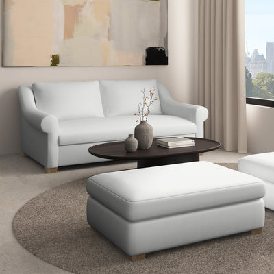 Perfect your seating arrangement with the Thompson Ottoman. The narrow frame and lean, tapered wooden feet evoke an elegance that is pared down to its essentials.